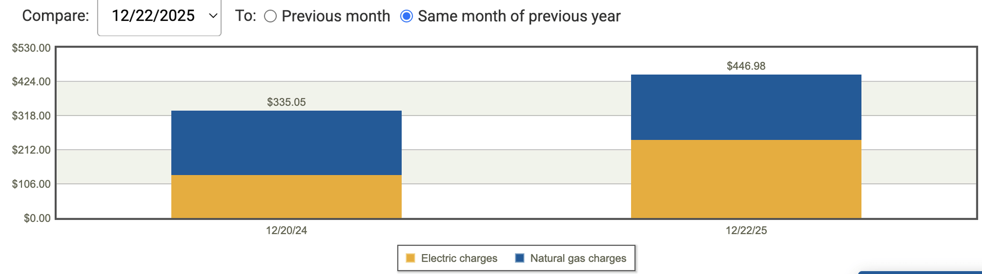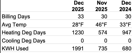 This compares December 2024, when we didn't have the Smart Home Panel 2 or the vast majority of satellite units, to December 2025. The steam humidifier was added in November 2025. So the bill went up by ~$110, the vast majority of that being electric. But this graph is a bit misleading. For you see, the December 2025 bill would have been at least $250 higher without TOU. (we say "at least" because gas appliance replacements contributed to bill shifts on the gas side as well - but we're only focusing on electric for this writeup.)