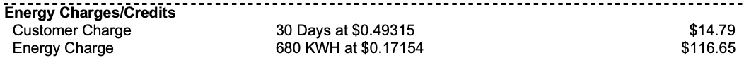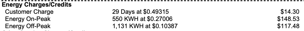 So if we take this 1681 number and calculate without TOU and without the customer charge, we get $288.36. The above total (without the customer charge) is $266.01. So not much saved at all by going with TOU alone (which is why peak shedding when done correctly is so powerful), because the on peak charge is so high that once you exceed ~20% of your total consumption, it starts to not be that good of a deal.